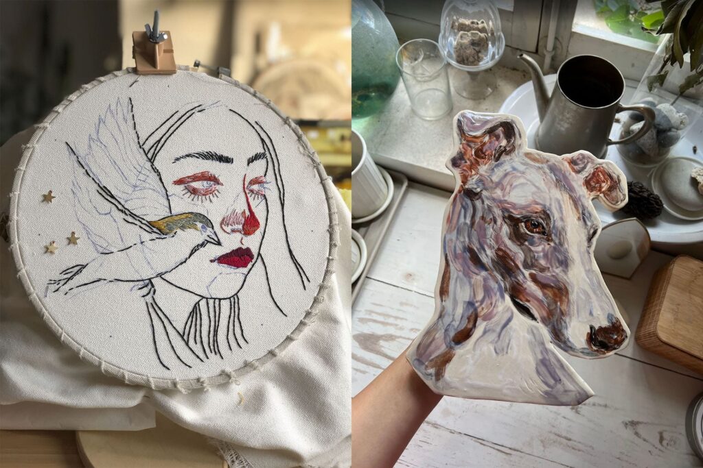 Desde 2021 también estoy experimentando con la cerámica, un material que me invita a pausar, a conectar con el ritmo lento de las manos y del barro. Es una experiencia más táctil y meditativa. Además, cuando tengo tiempo, me gusta bordar: en los hilos encuentro una forma de dibujar desde otro lugar, más silencioso, casi mágico.